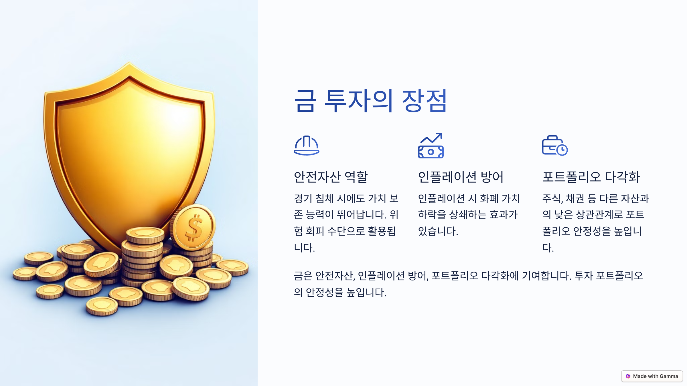 - 장점 : 실물 자산으로서의 안정성 제공.