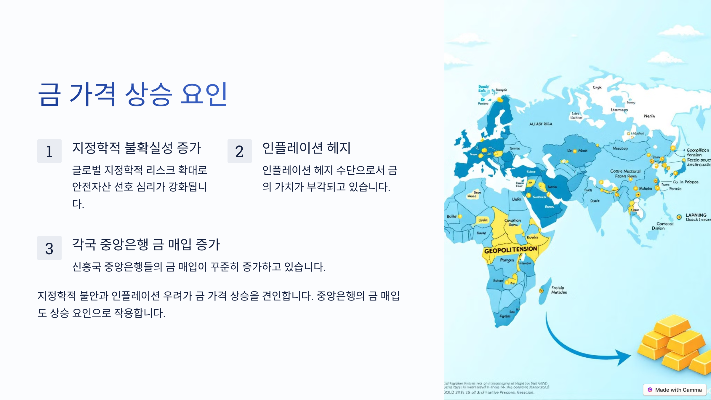 전쟁, 국제 분쟁, 경제 제재 등으로 금융시장이 불안정해지면 안전자산인 금 수요가 증가하여 가격이 상승했습니다. 최근 러시아-우크라이나 전쟁, 미중 갈등 등이 금 가격 상승을 촉진했습니다.